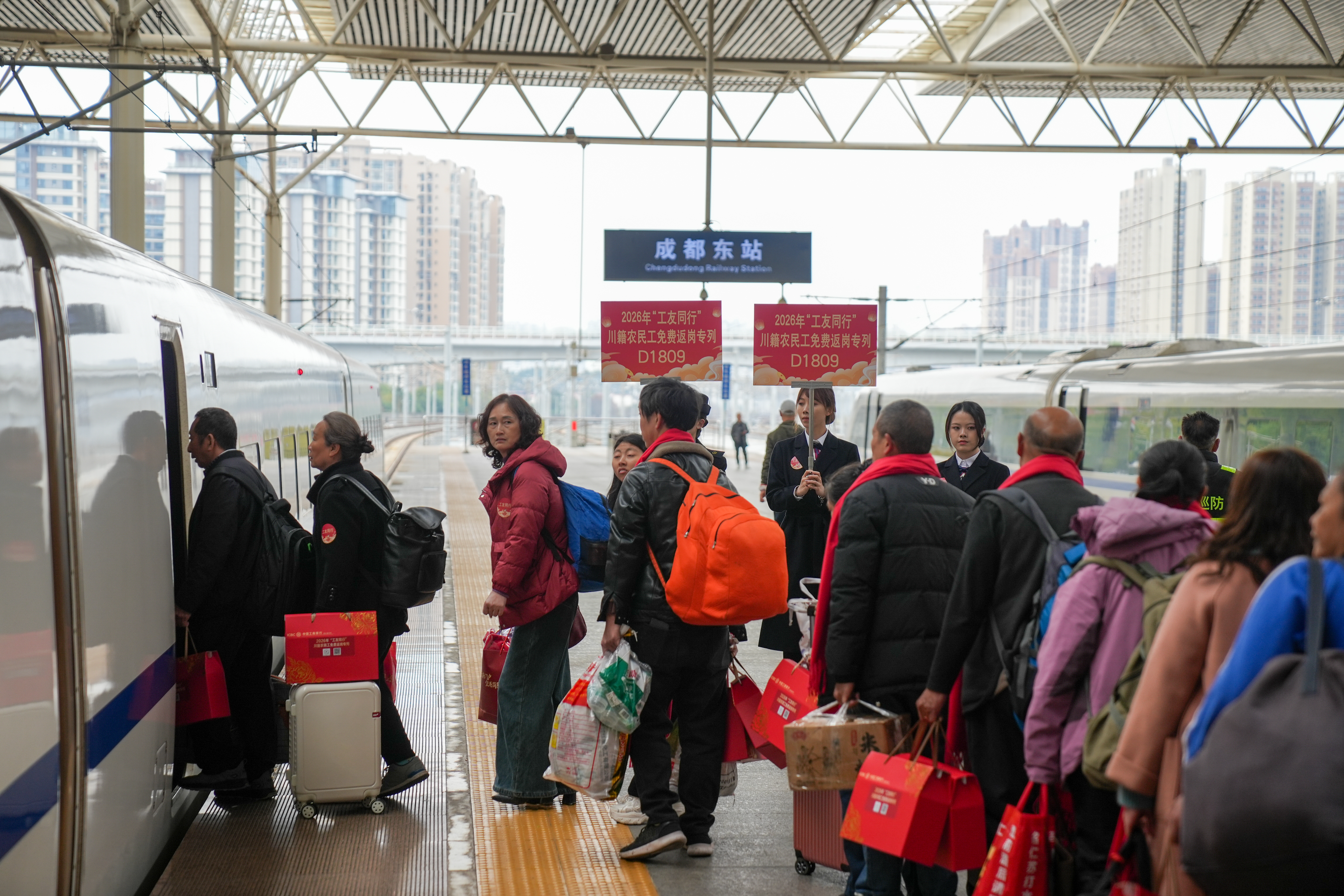 3月2日9时50分,140余名川籍务工人员提着暖心伴手礼,在工作人员引导下有序步入站台,搭乘D1809次列车从成都东站启程,奔赴广州南站。这是春节假期后,四川成都开出的首趟务工人员返岗专列。