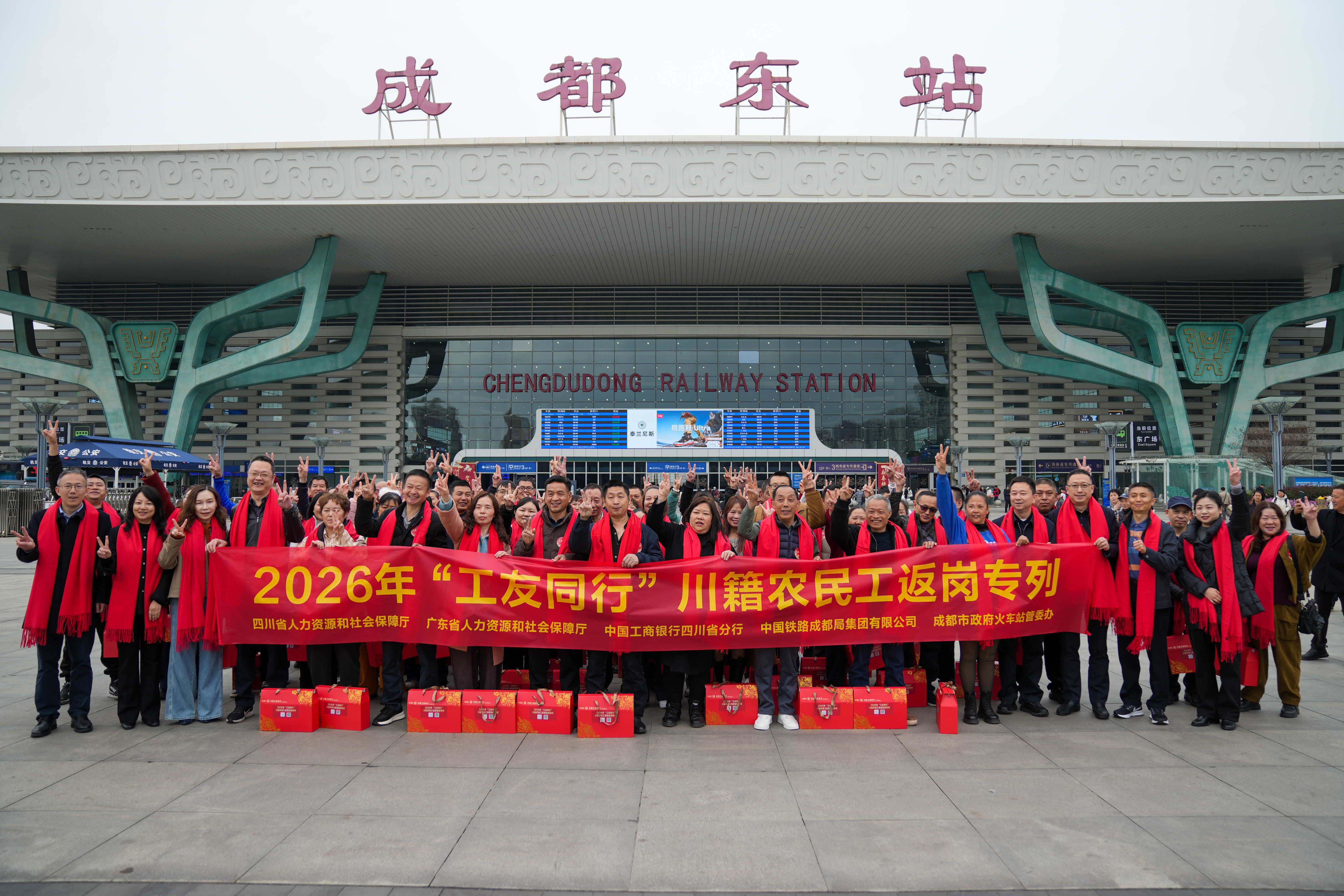 为做好节后务工人员运输服务保障工作,中国铁路成都局集团有限公司成都车站联合川粤两省人社部门,开行2026年“工友同行”川籍务工人员免费返岗专列,打通“出家门、上车门、进厂门”无缝衔接通道。